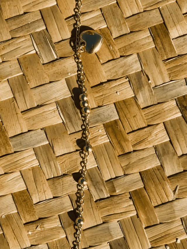 "Cœur" est une chaîne de cheville dorée empreinte de douceur et de romantisme. En son centre, un petit cœur doré symbolise l’amour, entouré de fines perles qui rythment la chaîne comme les battements d’un cœur amoureux.