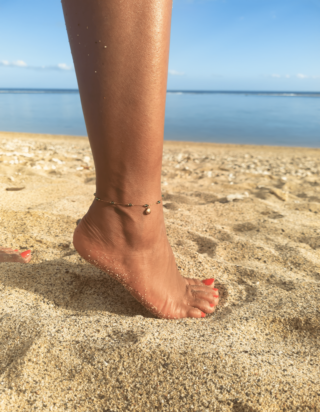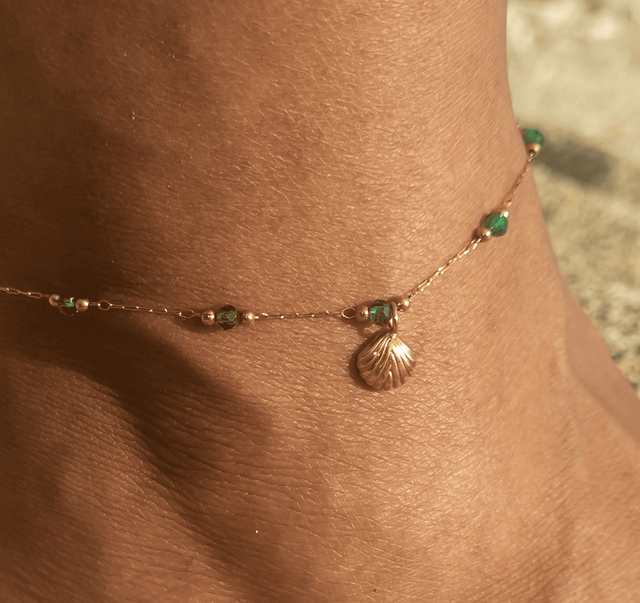 Cette délicate chaîne de cheville dorée capture la lumière avec élégance grâce à sa finesse et son éclat raffiné. Ornée de sublimes perles aux reflets émeraude, elle évoque la fraîcheur de la nature et l’élégance des joyaux anciens.